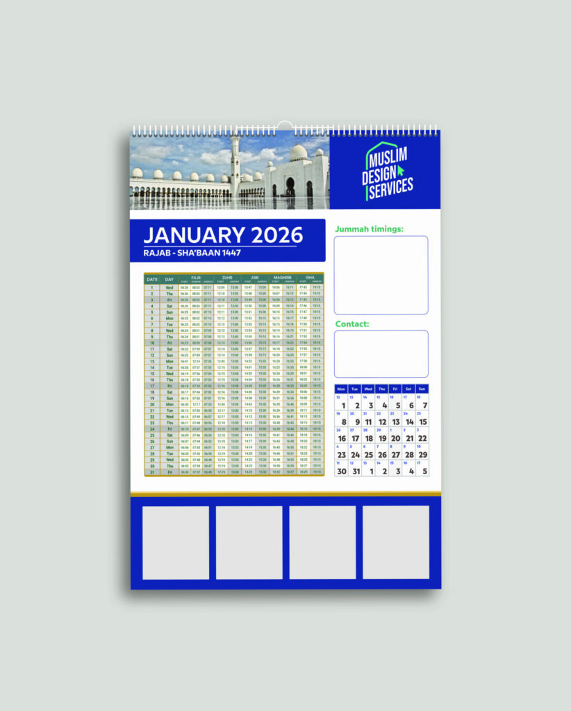 Our yearly salah calendars are the perfect way to keep track of prayer times throughout the year. We offer A3 and A4 sized calendars and bind it firmly.